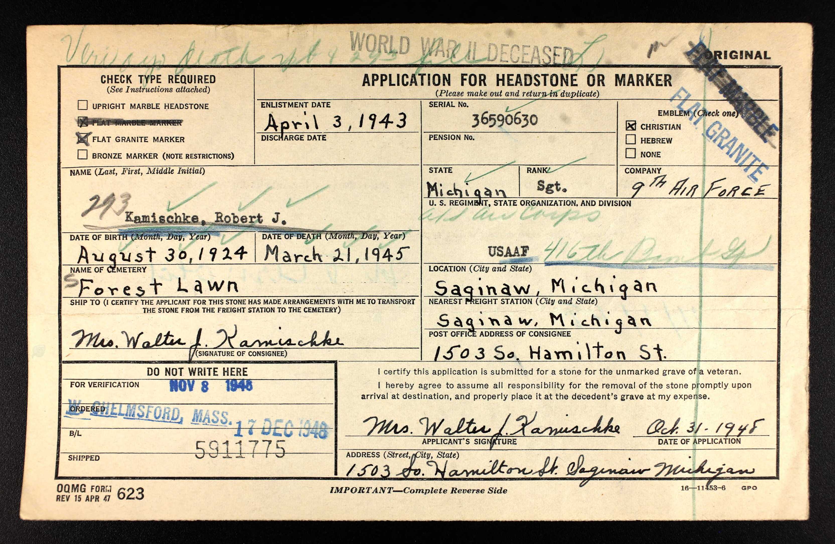 See also Sgt Robert J. Kamischke Individual Deceased Personnel File (IDPF)