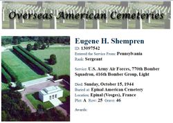 416th Bombardment Group (L) Sgt. Eugene H. Shempren Airplane Mechanic - Gunner, 13097542 Killed In Training - Oct 15, 1944 670th Bombardment Squadron (L) |