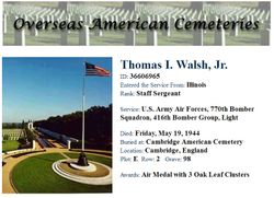 416th Bombardment Group (L) S/Sgt. Thomas Ira Walsh Jr. Airplane Mechanic - Gunner, 36606965 Killed In Action - May 19, 1944 670th Bombardment Squadron (L) |