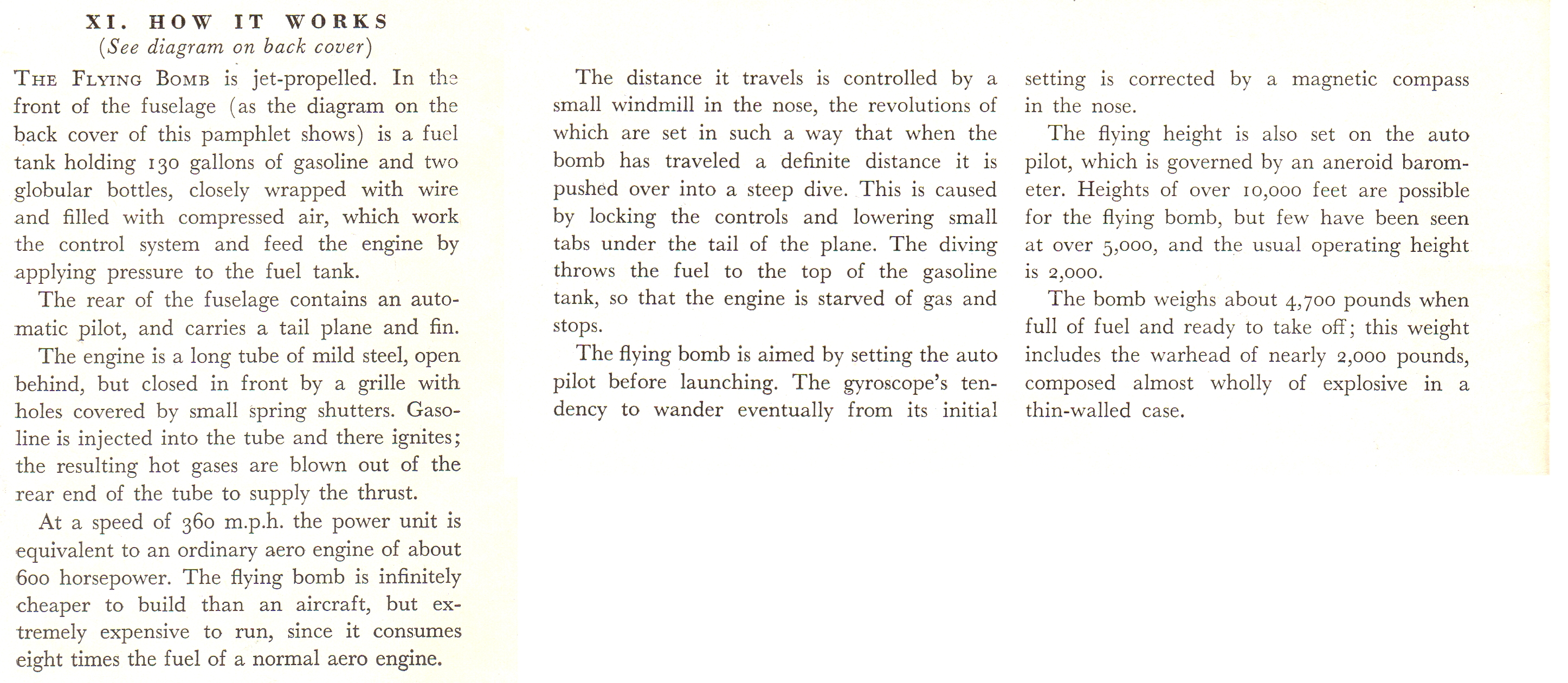 The booklet "Flying Bombs" published in December, 1944 by the British Information Services includes the following information regarding how the V-1 operated.