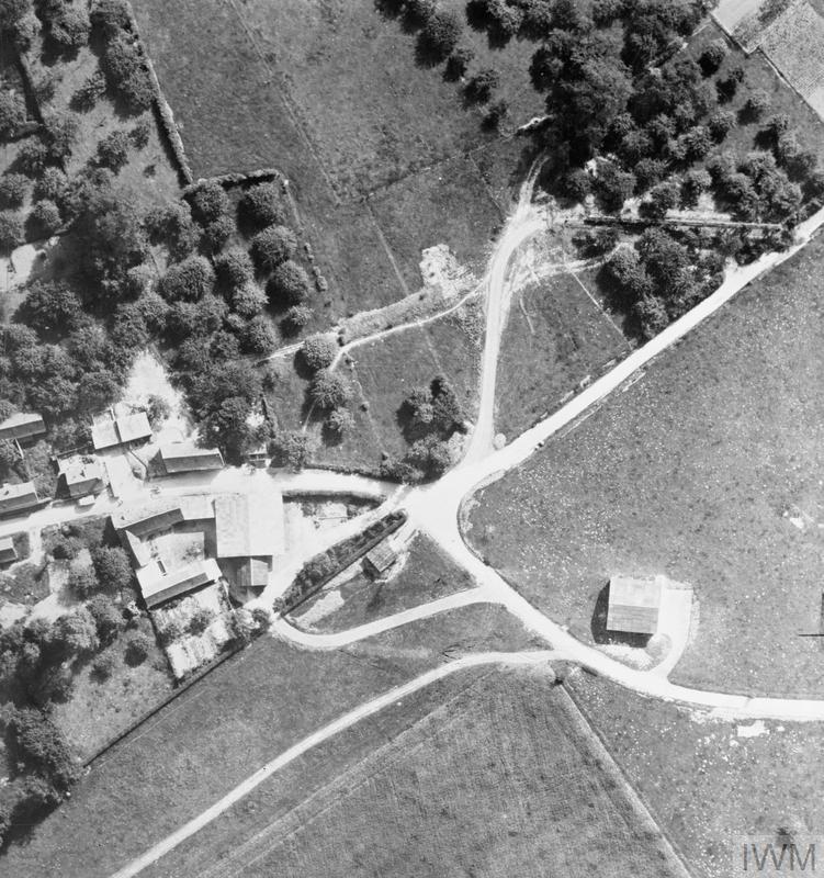 Vertical photographic reconnaissance view of the modified flying-bomb site at Vignacourt, Somme, France. The launching ramp can be seen in the orchard at top right. Directly below it is the non-magnetic building (Richthaus), and, to the left, abutting genuine farm buildings, is the bomb assembly building. Although betrayed by their size, both structures have been disguised with pitched roofs to blend into the local area.