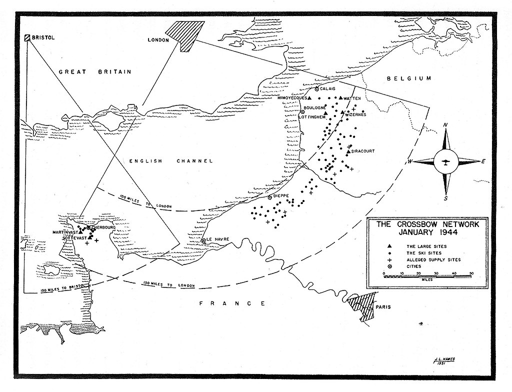 Right: Crossbow Network January, 1944. Map shows 2 primary areas where Germany was building V-Weapon Launch Sites.