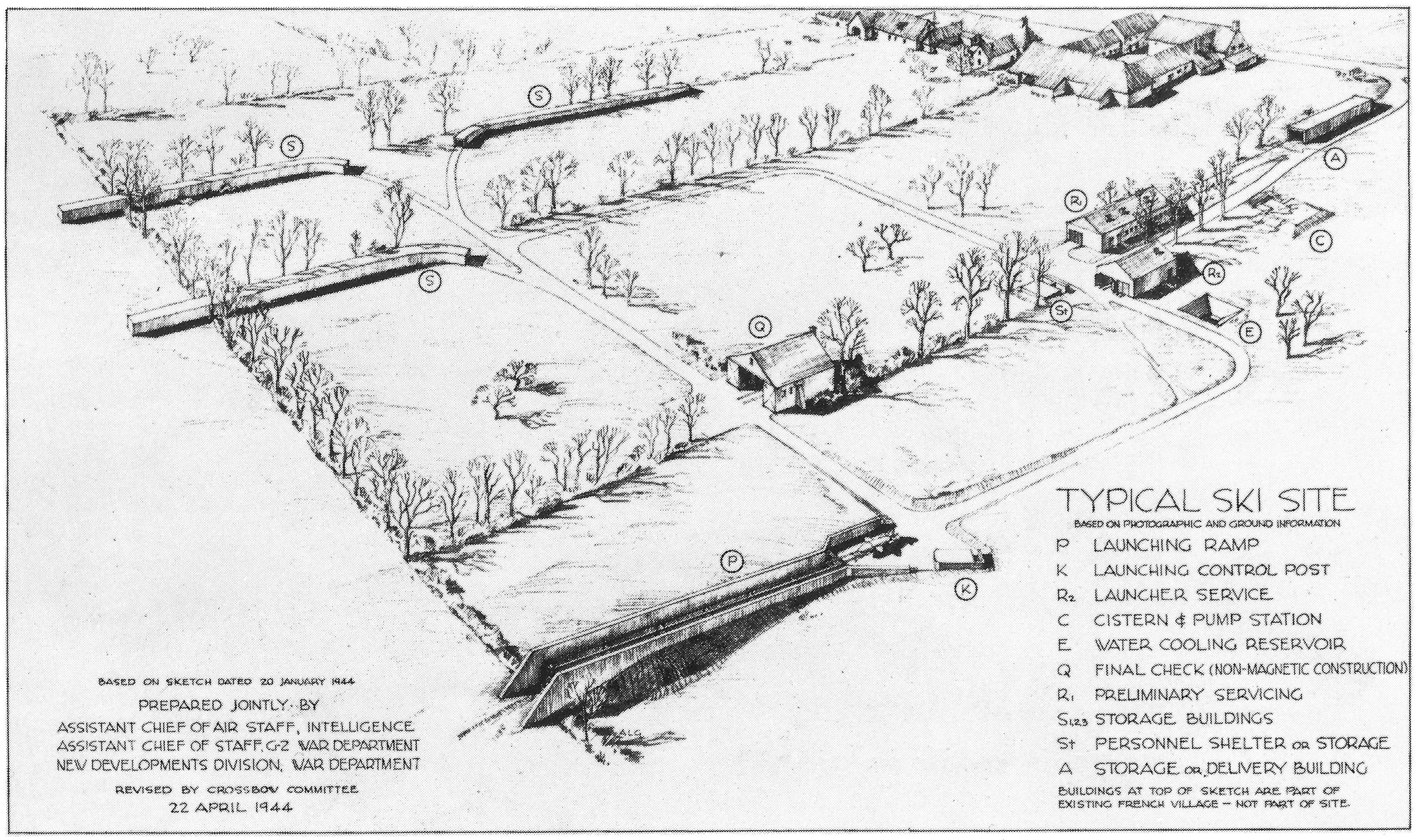 The initial "Site System 1" phase of V1 launch base development and construction contained 96 "Type A" sites along the coast of the English Channel between Dieppe and Calais, France. These sites were constructed with a launch ramp (shielded on both sides with concrete walls), a non-magnetic "alignment" building, a launch bunker, 3 long missile storage buildings (the "Skis"), along with other smaller storage buildings for fuel and supplies. (Zaloga, 2005)