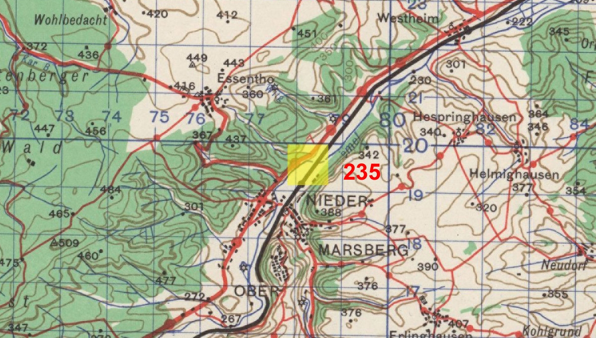 The Wieder-Marsburg [Nieder-Marsberg] R.R. Bridge was attacked, by the use of visual bombing equipment. A ground haze obscured the area. Another bridge, approximately 3 1/2 miles from the primary target was attacked by Capt. Stebbins and Lt. Calloway and their flight. This flight scored excellent results in the attack.