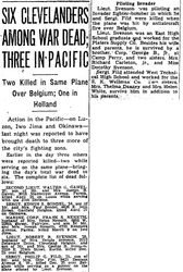 Missing Staff Sergt. Philip G. Fild, 21, son of Mr. and Mrs. Otto Fild, 9421 Denison Avenue S.W., missing over Germany since Dec. 25. Sergt. Fild was serving as a waist gunner on a Havoc bomber when he was reported missing. He has been in the air forces since February, 1942, and overseas since March, 1943. The gunner has two sisters, Mrs. Thelma Danzey and Mrs. Helen White. He had completed more than 50 missions and has been awarded the Army Air Medal with eight clusters. Extracted from Newspapers.com |