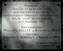 There was one training accident during the month. While on a practice bombing mission on the 10th November, an A-20, piloted by 2d Lt Richard C. Miles of the 668th Bomb Sq (L), crashed about three miles south of Fontaineblue. The plane was seen to break through a low overcast in an unconventional spin--possibly an inverted spin. It struck the ground and was almost completely demolished. No one was seen getting out of the plane although the body of Corporal Samuel A. Pepe was found 500 yards from the crash, evidently thrown clear of the plane during the spin. There was no evidence of engine failure. Lt Miles, his bombardier-navigator, 2d Lt William G. Kelly, and the two gunners, Corporal Pepe and Corporal Terrance F. Morrissey, were all killed. The four men were interred at the American Military Cemetary at Solers, France. These were our only losses during the month of November.