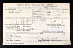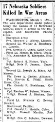 Entered Military Service: Date: 9-Jan-1942 At: Newark, NJ From: Burt County, Nebraska NARA Enlistment Record: Enlisted Serial # 12049976 Buried: Fort McPherson National Cemetery, Maxwell, Nebraska, Plot: F, 0, 1203 On-line Memorials: National World War II Registry Find-A-Grave (1) Find-A-Grave (2) |