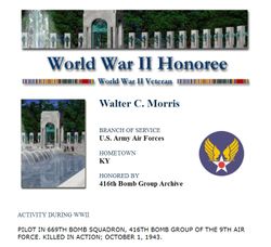 416th Bombardment Group (L) 2Lt. Walter Calvin Morris Pilot, O-684382 Killed In Training - Oct 1, 1943 669th Bombardment Squadron (L) |