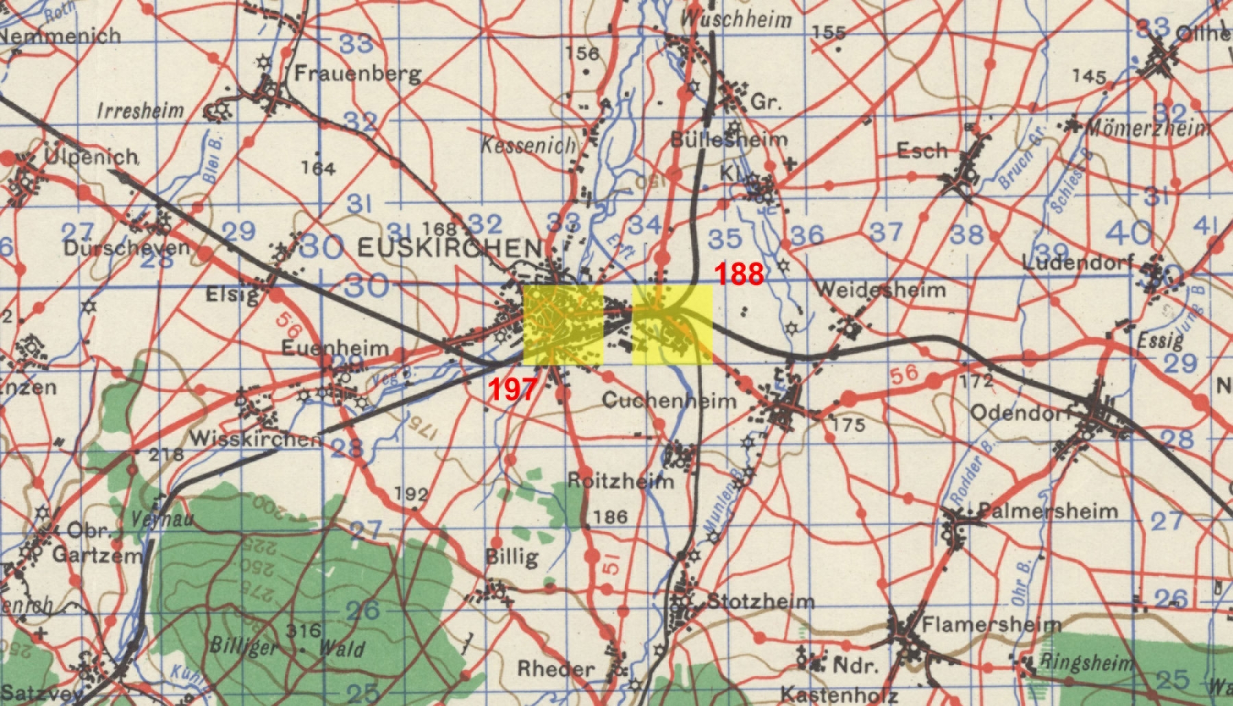 The next day the Euskirchen communications center was bombed with excellent results. This village was being used by the enemy as a supply and housing center for troops enroute to the front. Twelve 670th crews took part in disrupting this vital communications point.